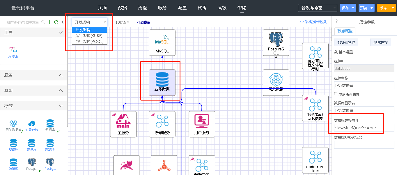 进入架构设计页面,开发架构和运行架构中都需要设置。设置方法是:点击业务数据,设置数据库连接属性为allowMultiQueries=true,如下图所示