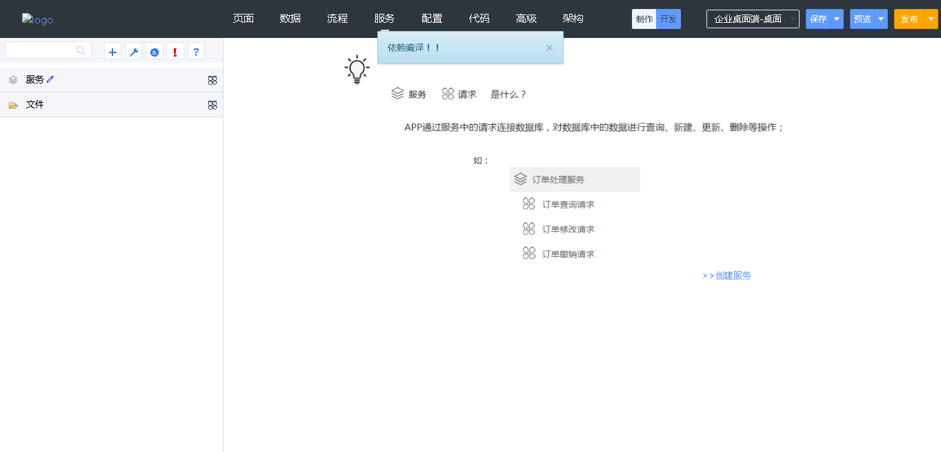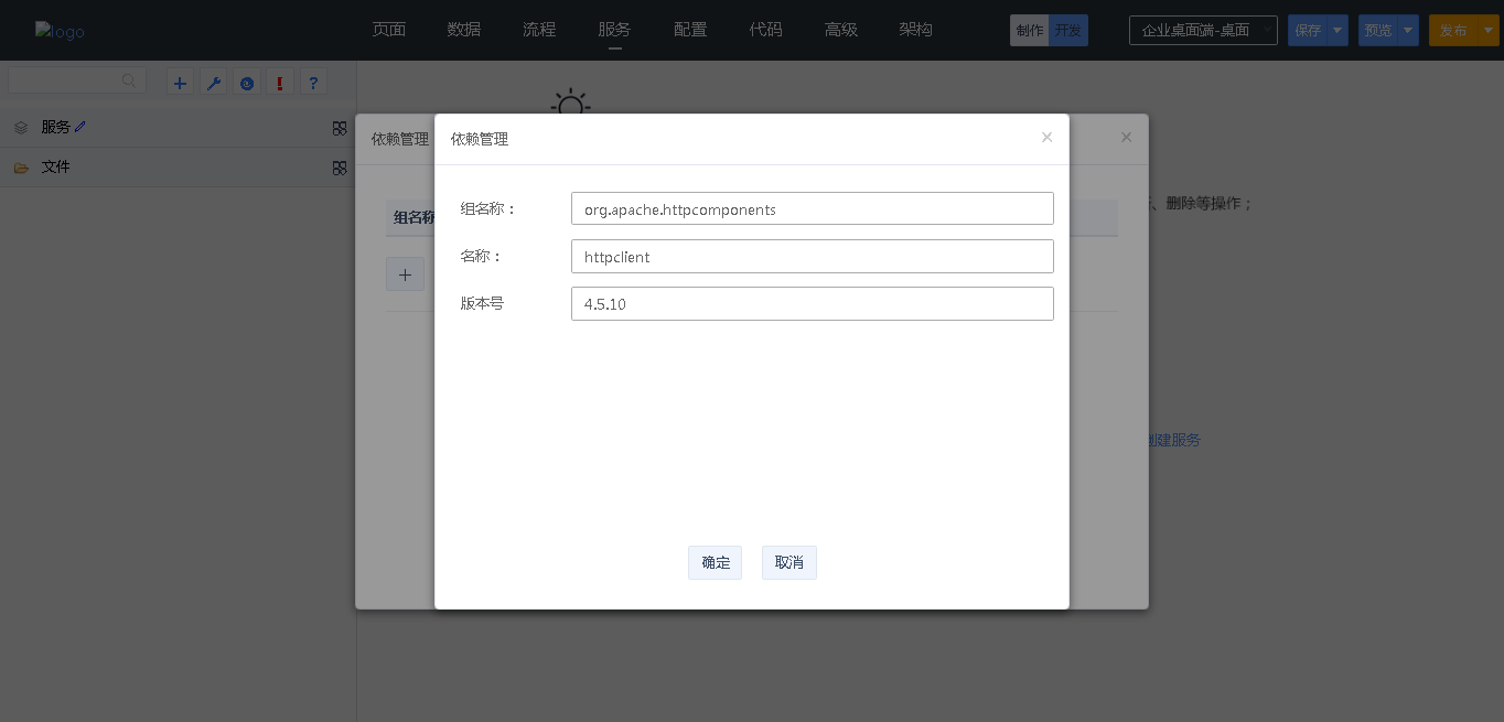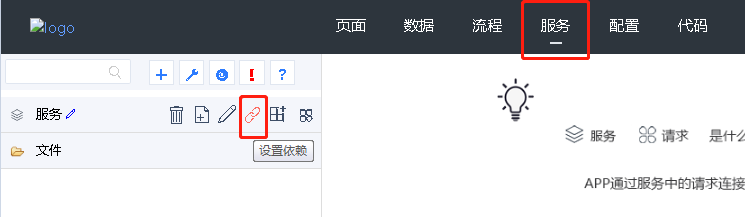 在服务页签中,点击服务右侧的设置依赖按钮,弹出依赖管理对话框,