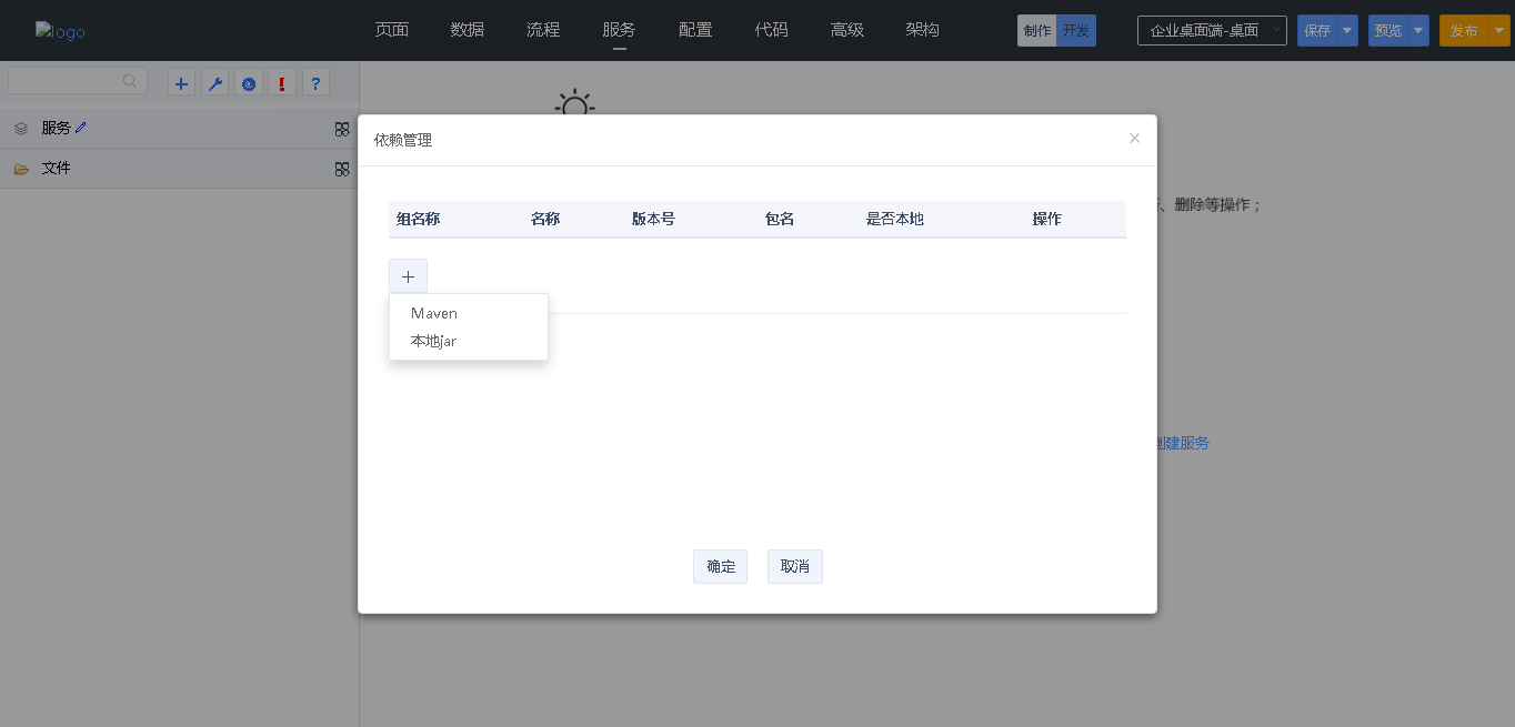 在服务页签中,点击服务右侧的设置依赖按钮,弹出依赖管理对话框,点击+按钮,选择本地jar,打开上传依赖包对话框。