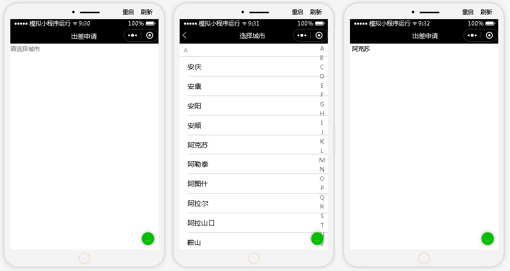 切换到应用端,预览,此时打开的城市列表页面是继承的页面
