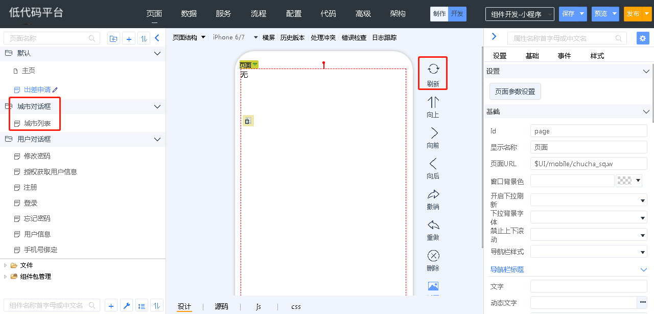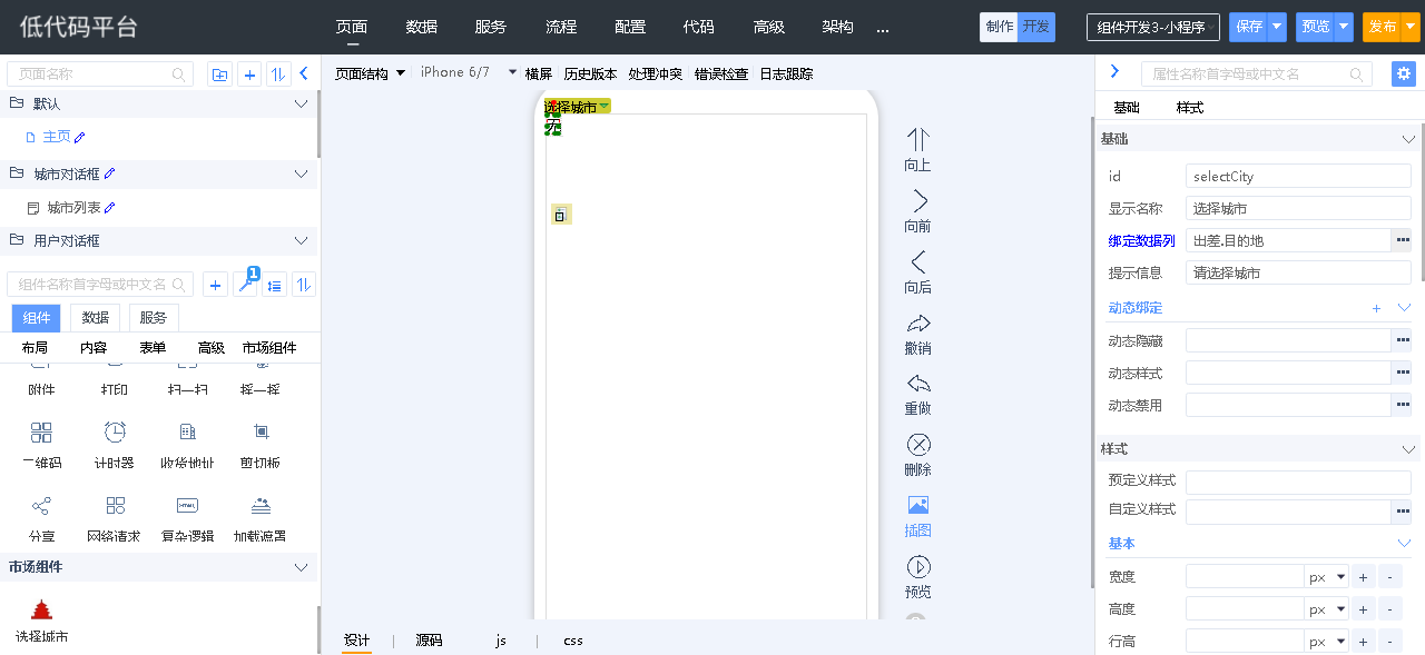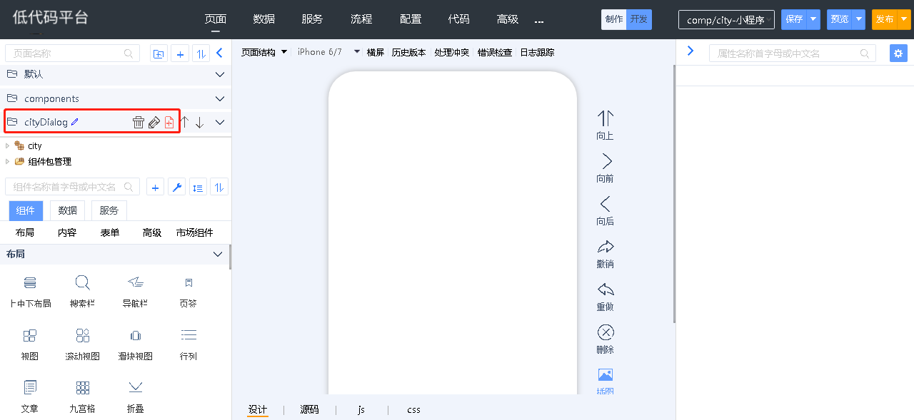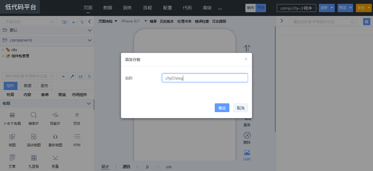 运行时,点击组件弹出城市列表,城市列表即是组件中的页面。切换到页面设计区,先添加页面分组,再添加页面。