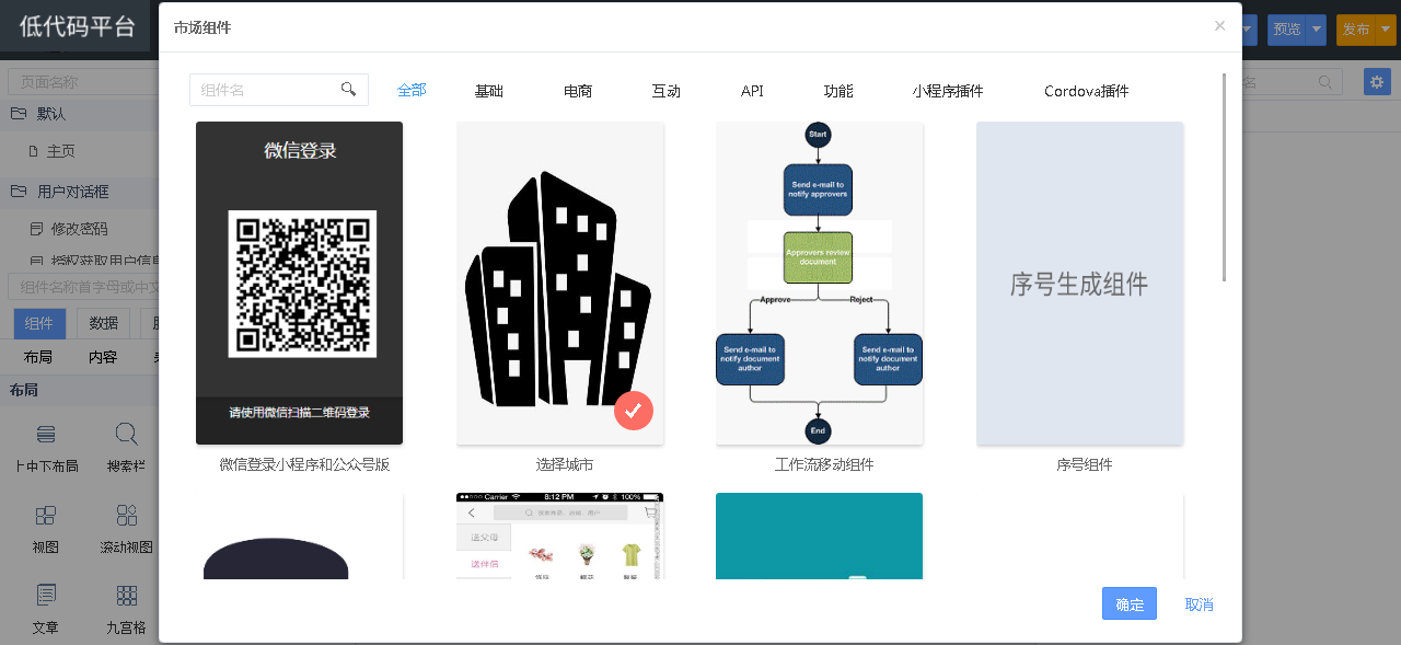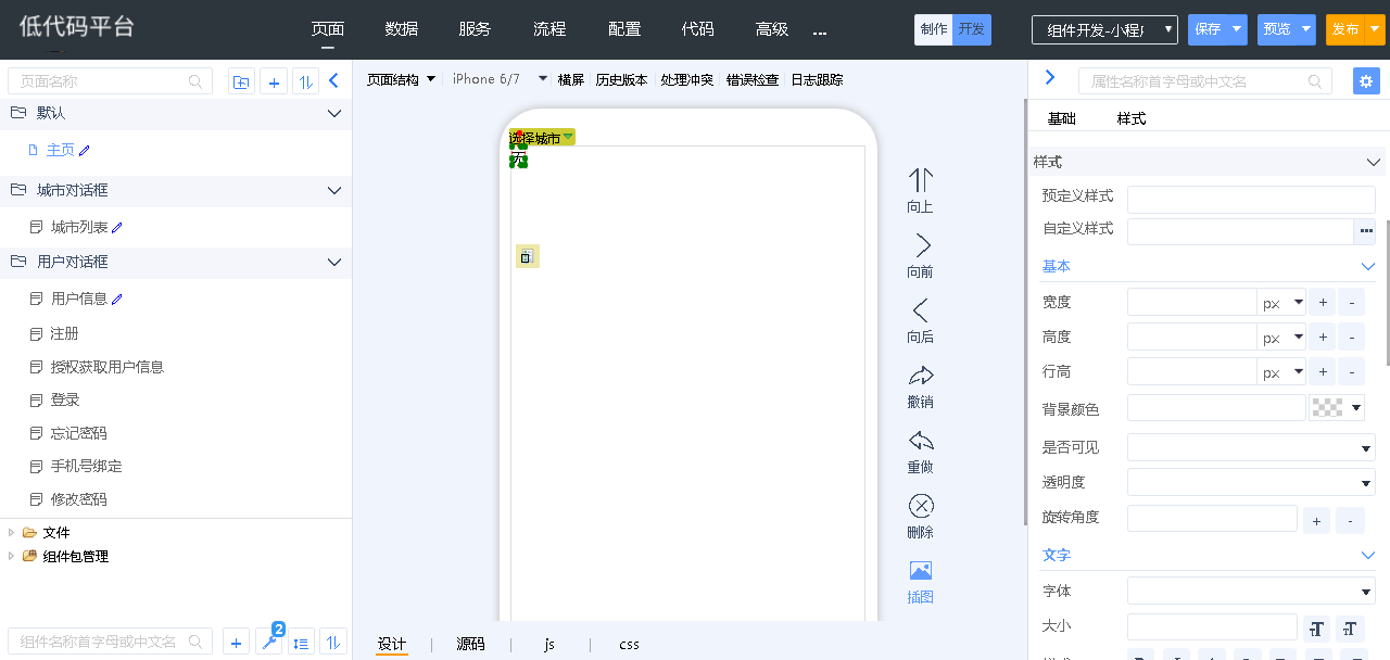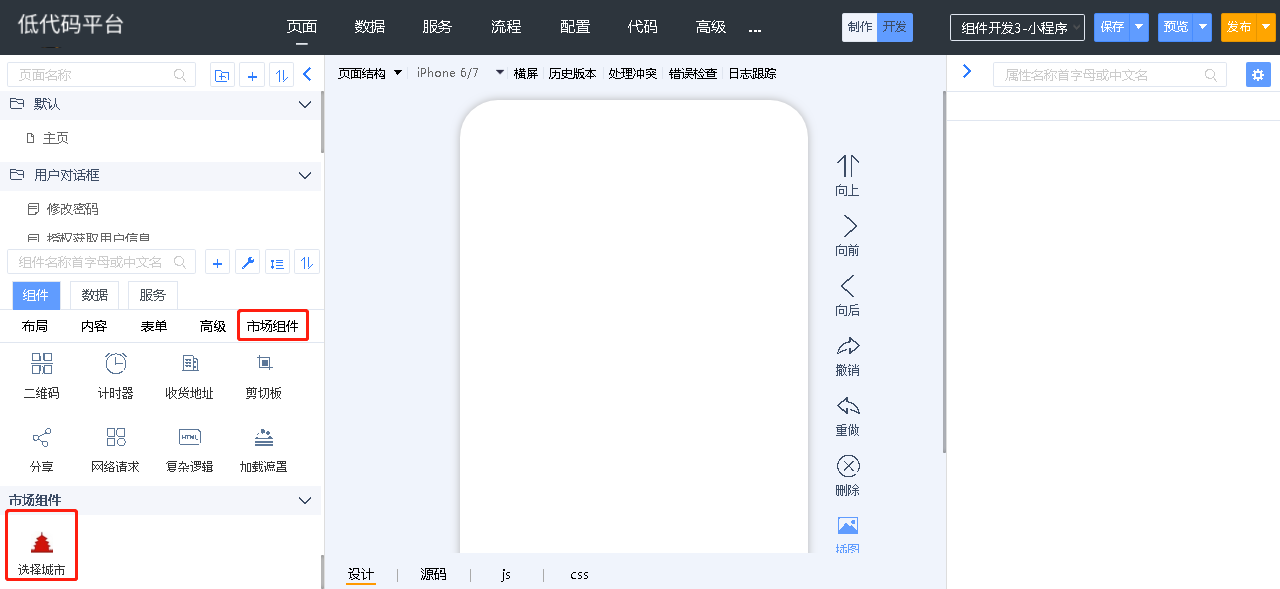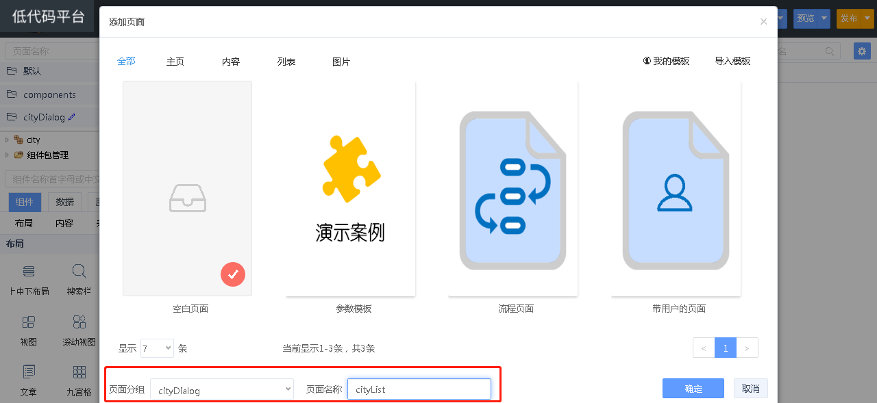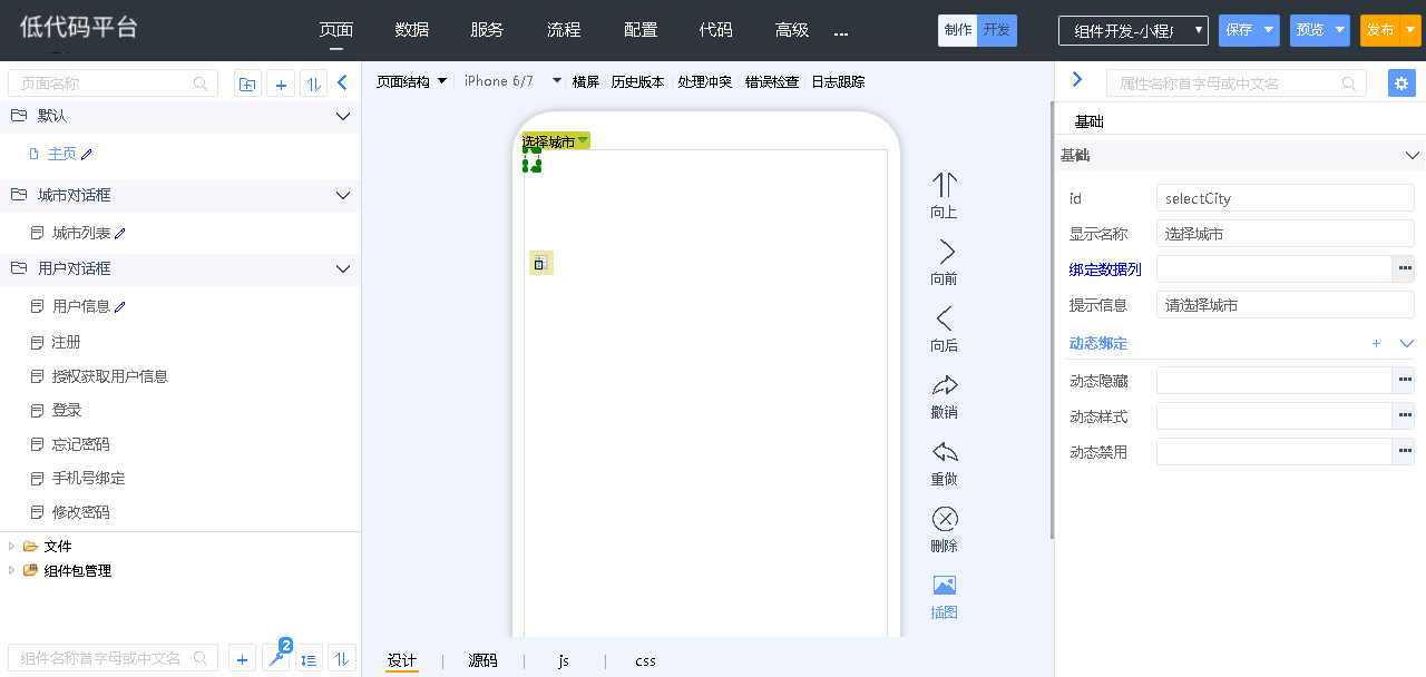 运行时,点击组件弹出城市列表,城市列表即是组件中的页面。切换到页面设计区,先添加页面分组,再添加页面。