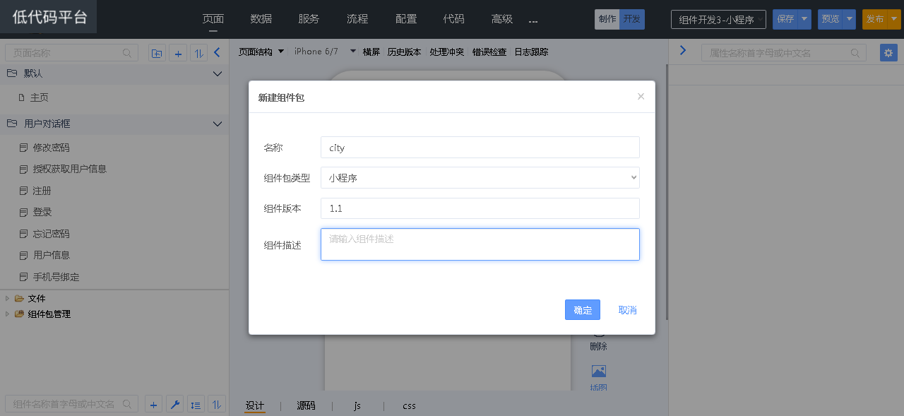 输入组件包名称city,选择组件包类型为小程序,输入组件版本1.1,单击确定按钮新建组件包