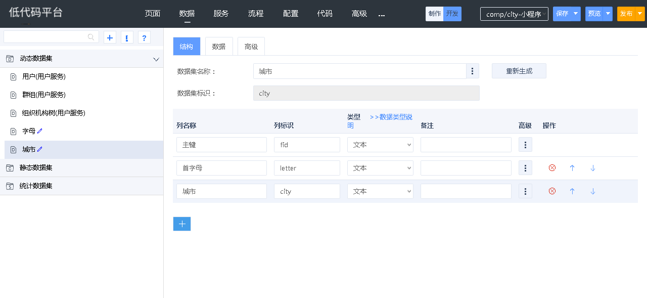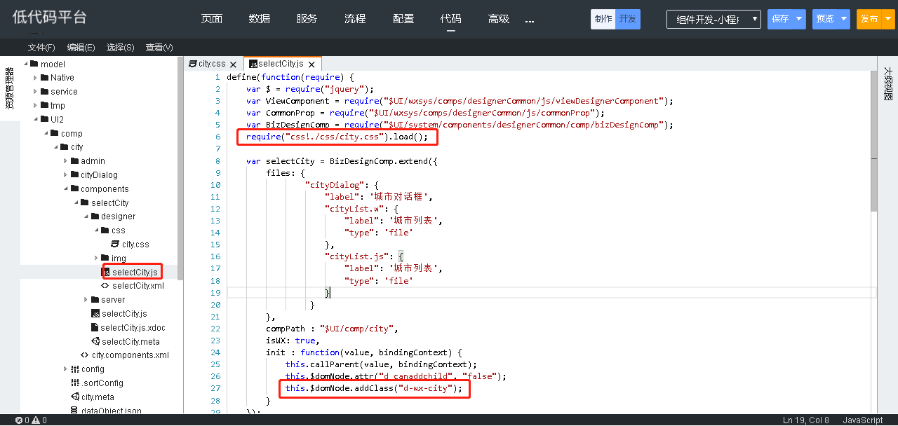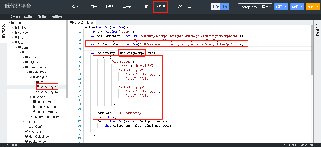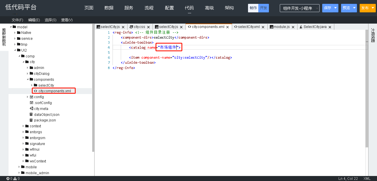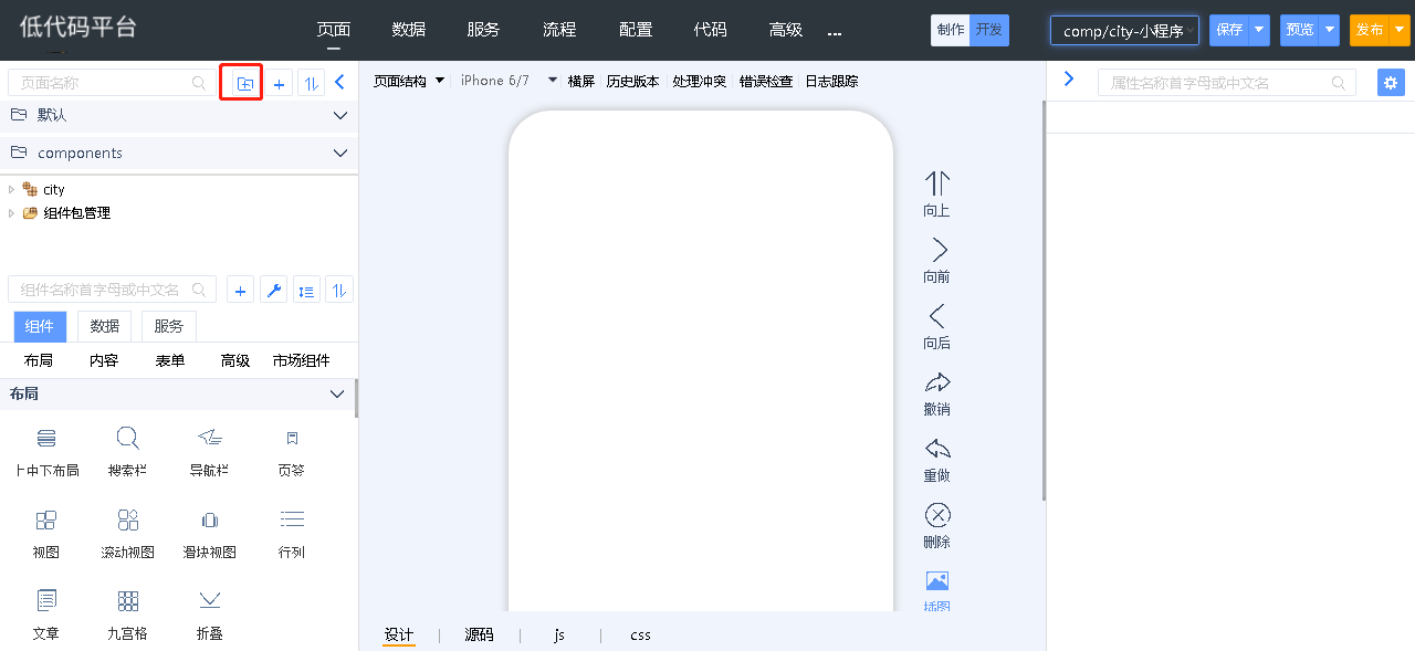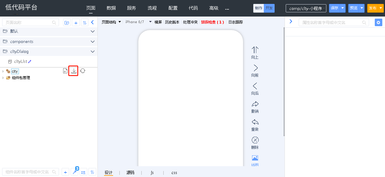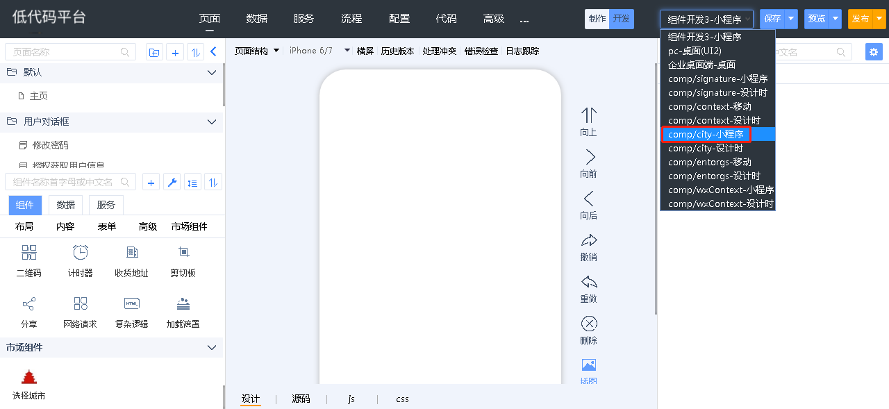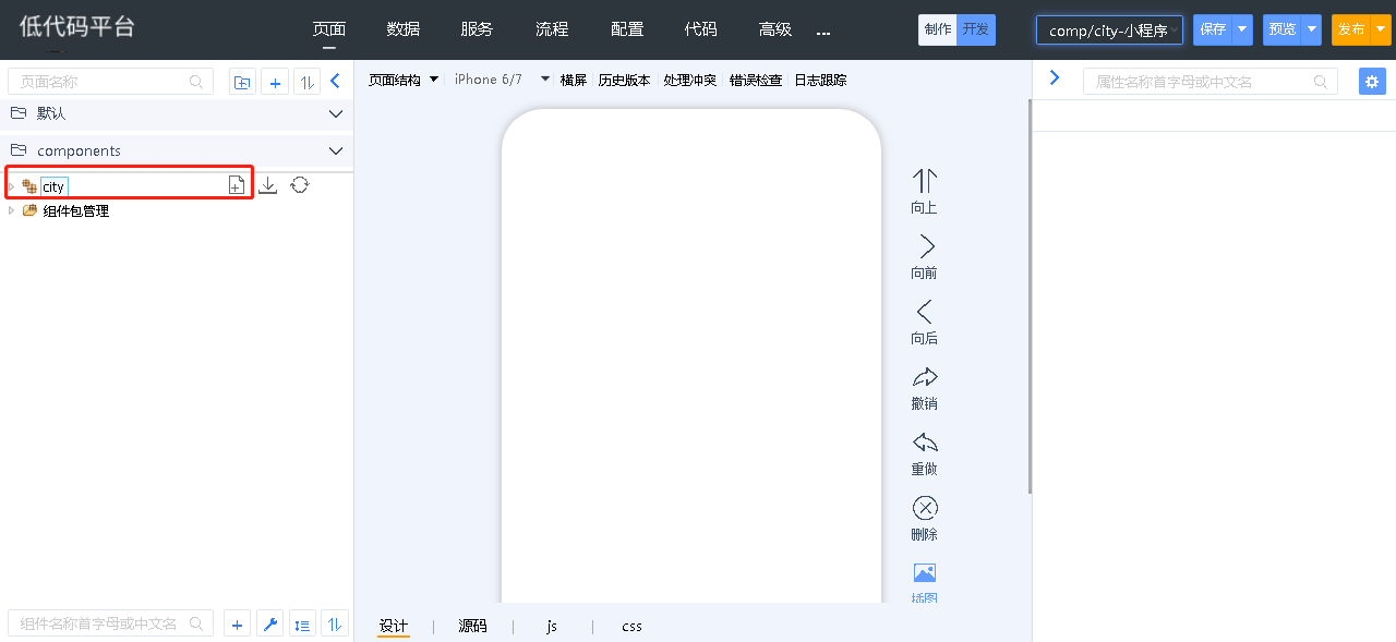 组件创建后,自动切换到“comp/city-小程序”端,在这里可以进行页面、数据和服务的可视化设计,也可以编辑编译时文件和运行时文件。手动切换到“comp/city-设计时”端,可以编辑设计时文件。也可以切换到“代码”页面,编辑设计时文件、编译时文件和运行时文件