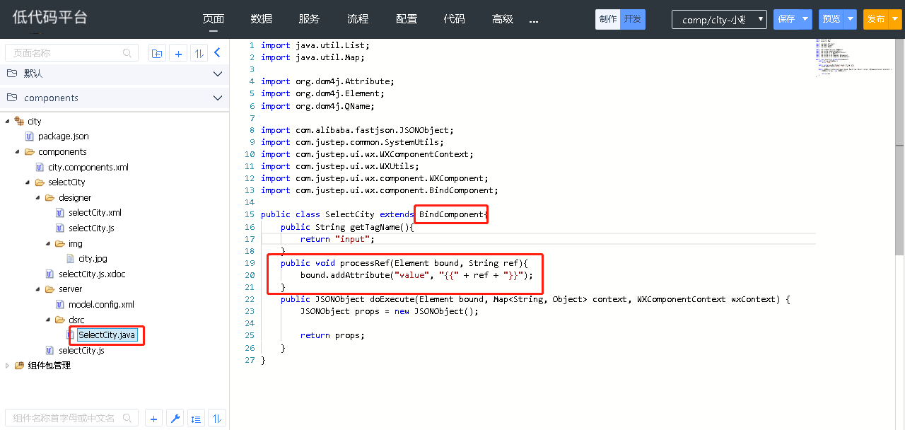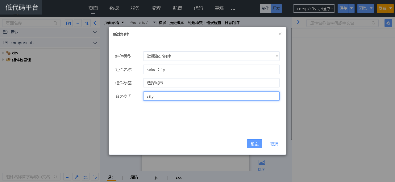 组件类型选择数据绑定组件,组件名称输入selectCity,组件标签输入选择城市,命名空间输入city,单击确定按钮新建组件