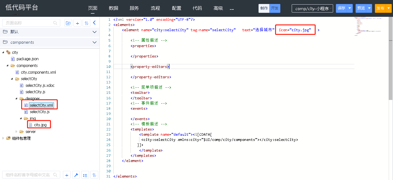 打开组件描述文件,在element标签中添加 icon="city.jpg"