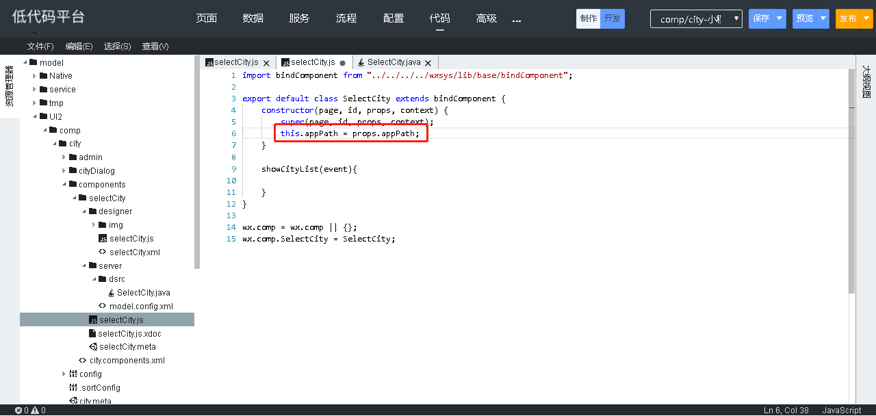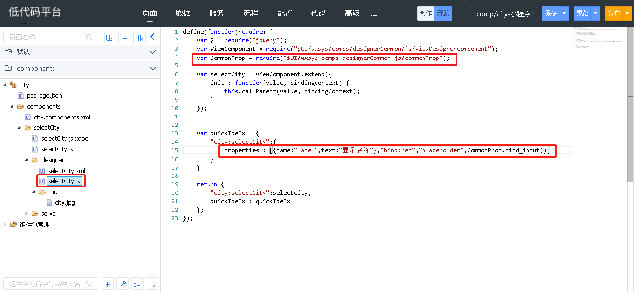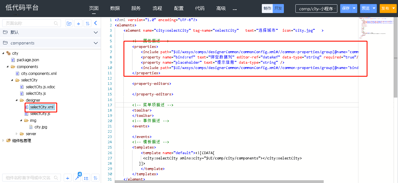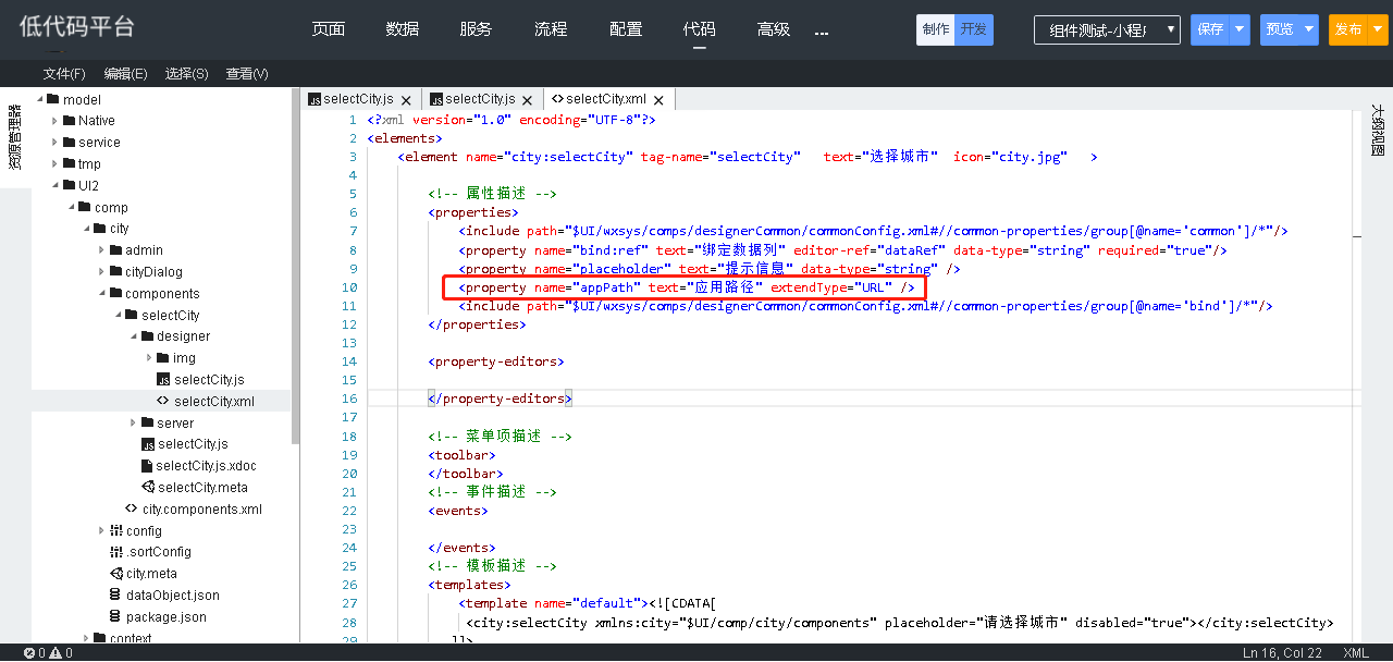 切换到comp/city-设计时,打开组件描述文件,添加appPath属性,用于获取端的目录。该属性不需要显示,因此不需要在设计时JS文件中添加该属性