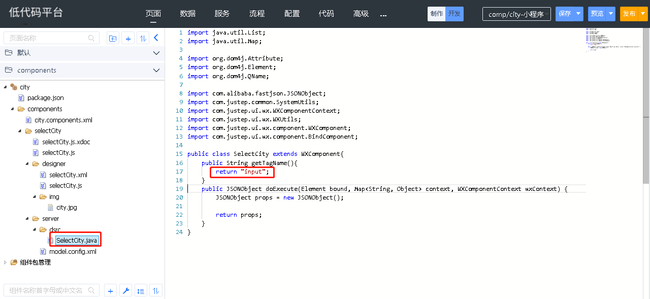 组件在w文件中是city:selectCity标签,编译为input标签,打开编译文件将return "selectCity"; 改为 return "input";