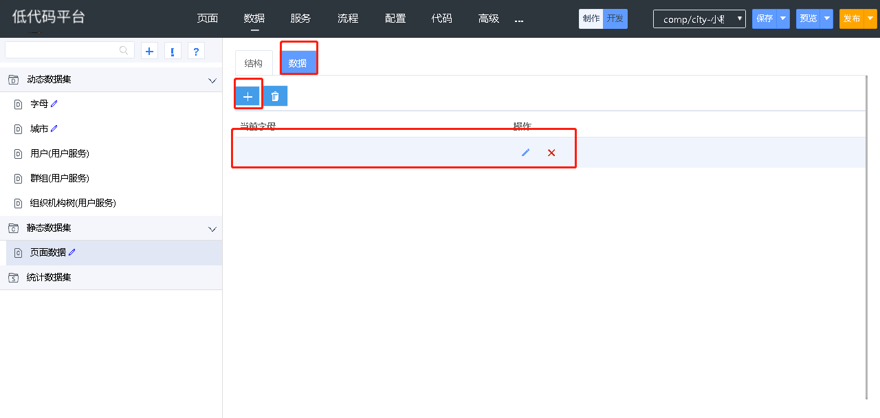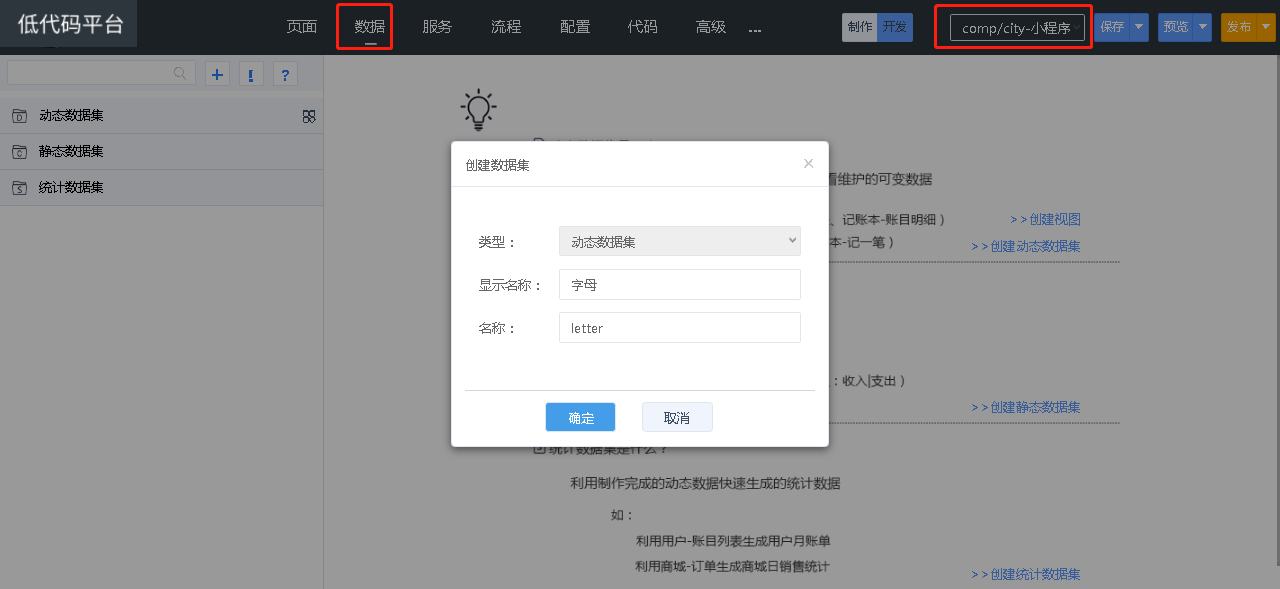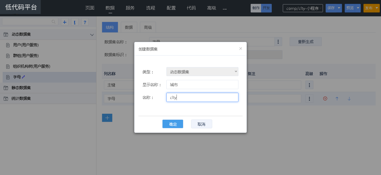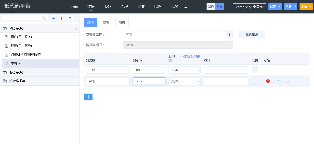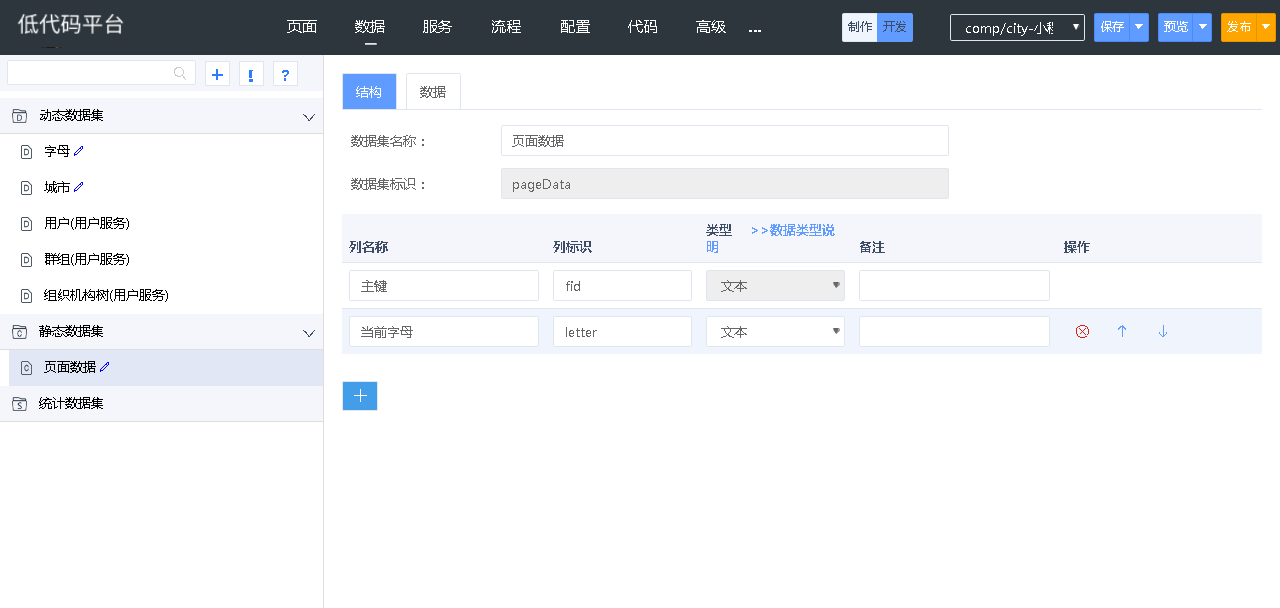 城市数据由组件提供,因此需要添加组件中的数据。切换到数据设计区,添加动态数据集:字母