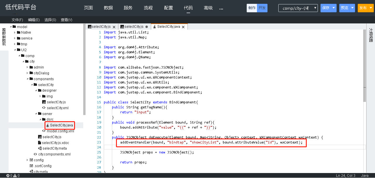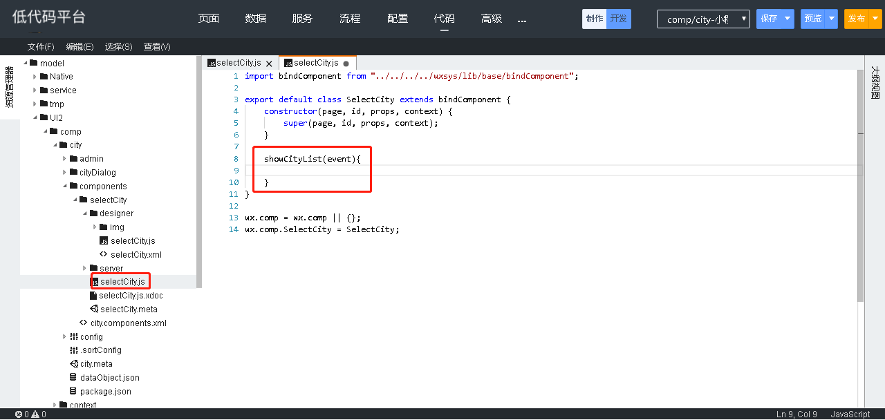 切换到代码页面,打开运行时JS文件,添加showCityList方法