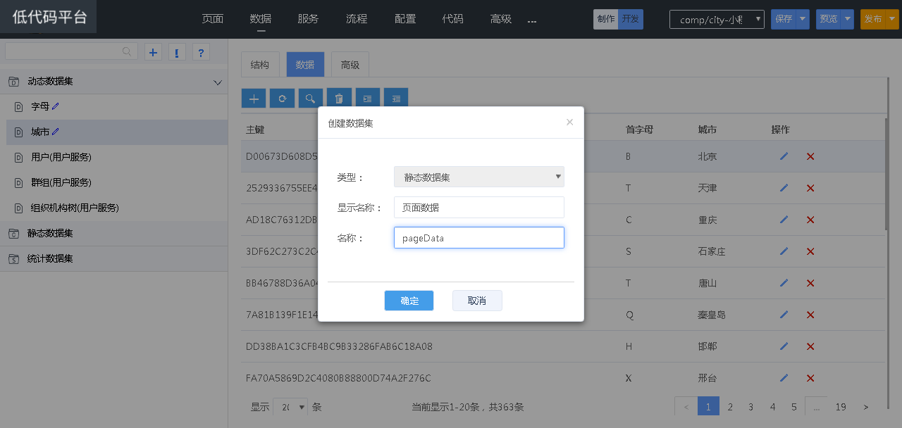 - 添加城市数据集,修改id为cityData,设置按首字母和城市排序,分页大小设置为-1