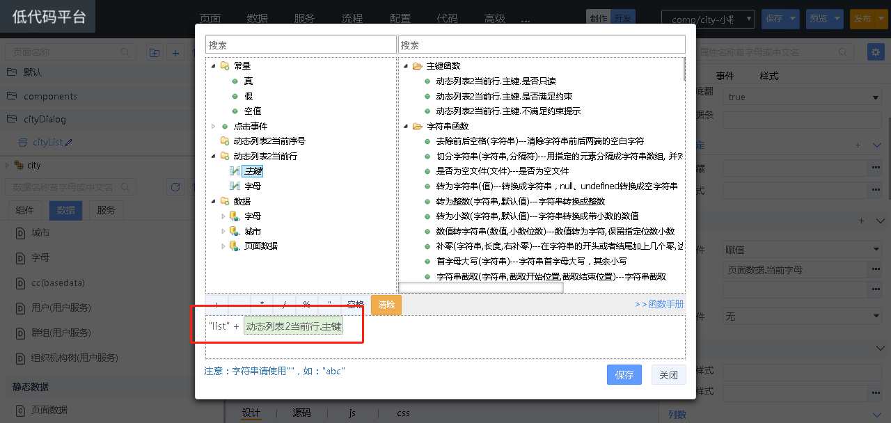 - 选择新添加的动态列表,点击事件选择赋值,目标列选择“页面数据.当前字母”,值输入"list"+动态列表2当前行.主键,如下图所示