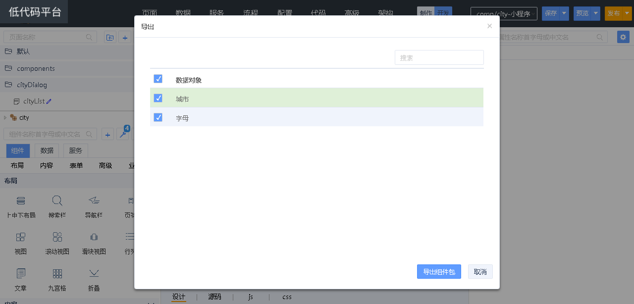 组件中的字母和城市数据需要带在组件包中,因此选中这两个数据,点击导出组件包