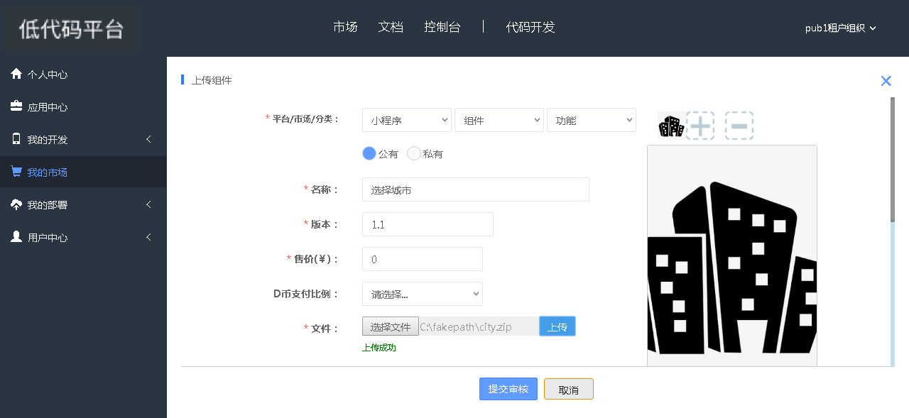 进入控制台,打开我的市场功能,点击上传组件按钮,再点击上传按钮,输入组件包信息,上传组件包文件,点击提交审核按钮