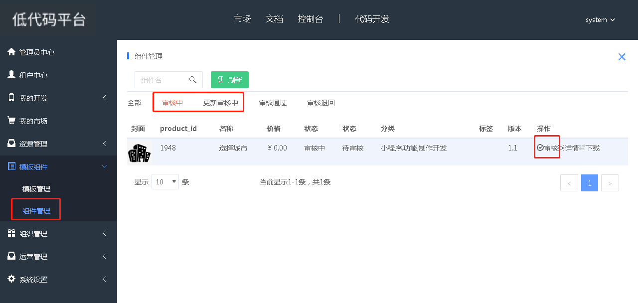 控制台管理员system进入控制台,打开模板组件中的组件管理功能,点击审核中或更新审核中,显示出提交待审核的组件,点击审核按钮,再点击通过按钮