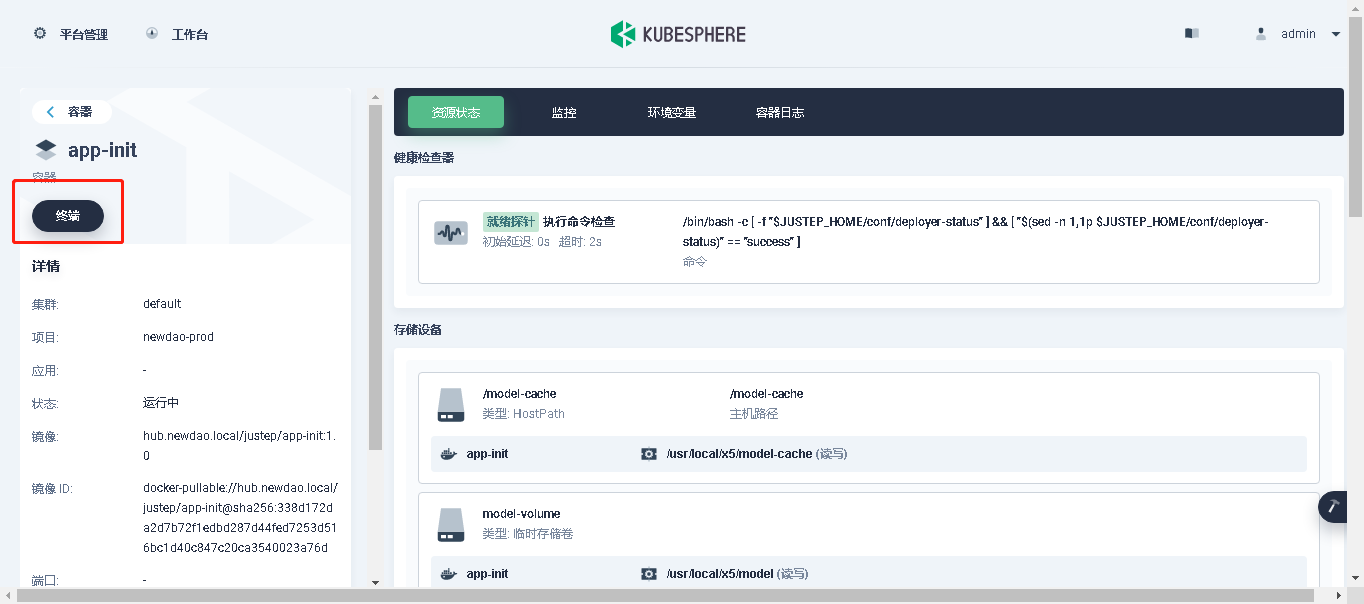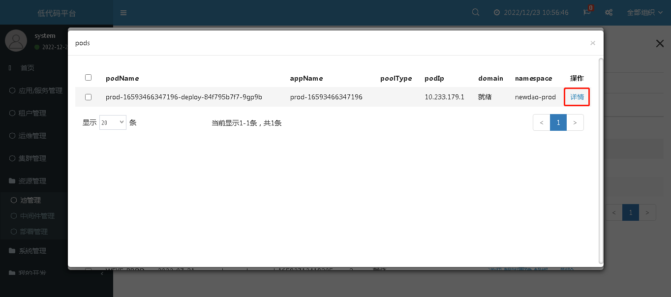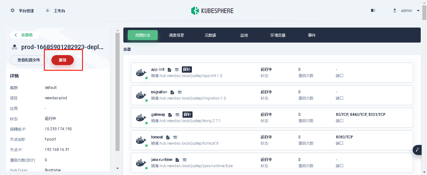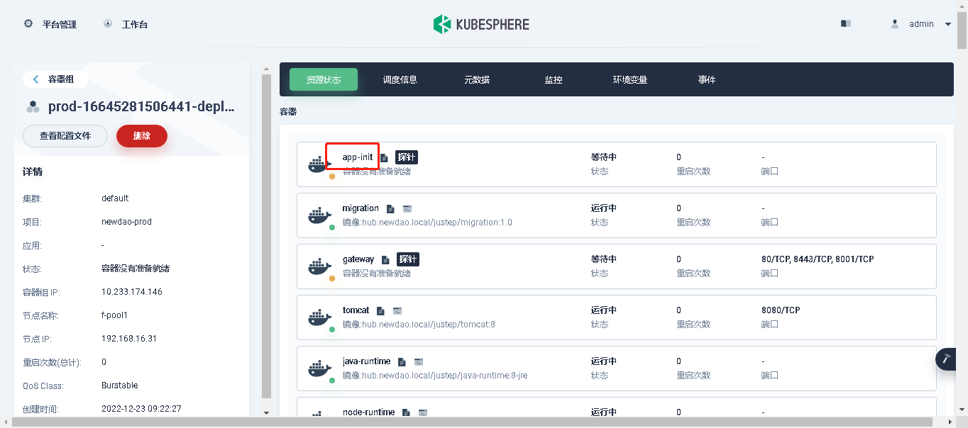 其中resservice密码的获取方法是进入kube控制面板,选择 newdao-console 名空间,打开 pods ,搜索 resservice,打开池,找到 resource_passwd