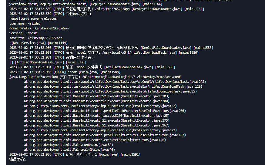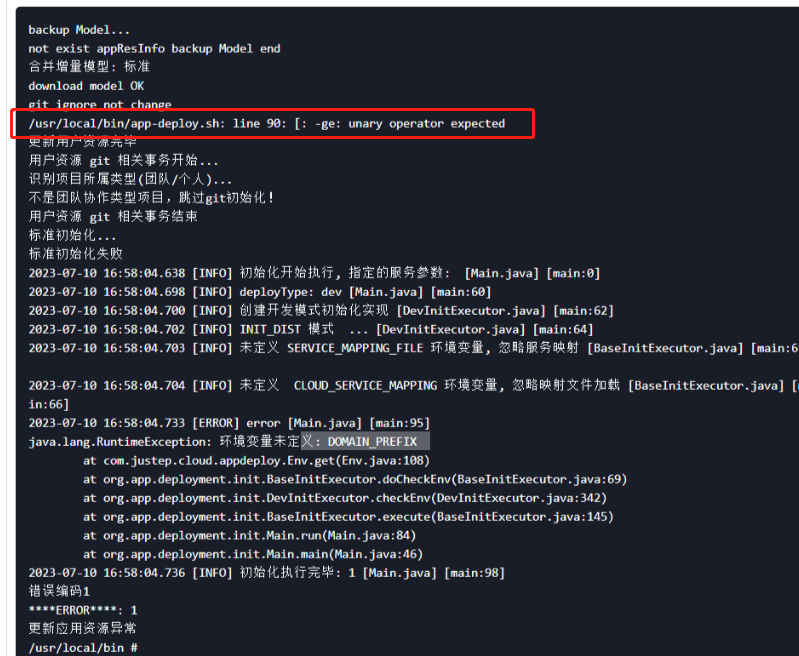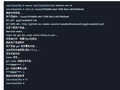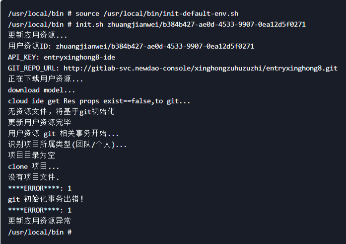 日志中显示解压用户主资源失败,或网关连接失败。执行下面的命令(第一句表示不使用缓存),看看初始化是否成功