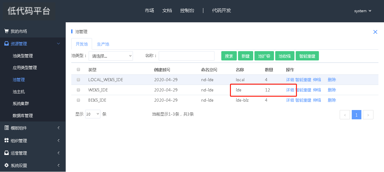 用system登录控制台,打开“资源管理——池管理”功能,如下图所示