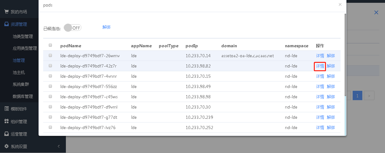 点击ide右侧的详细按钮,显示ide池列表,如下图所示