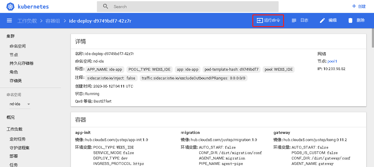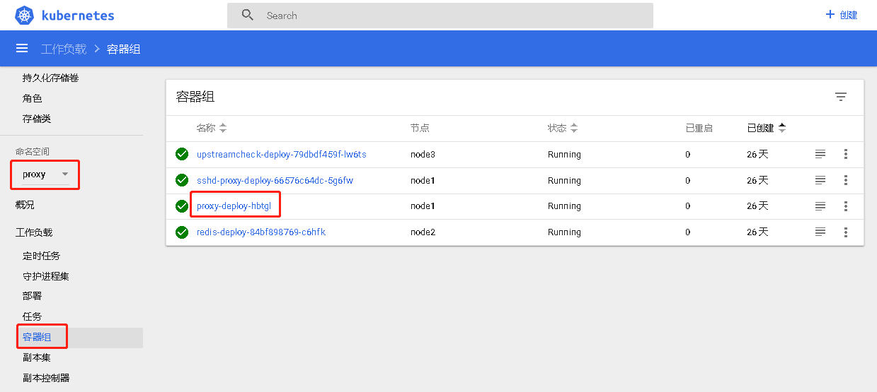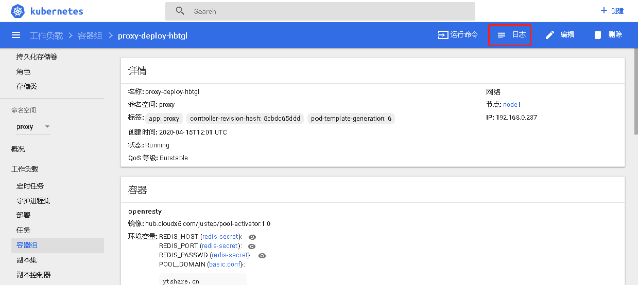 命名空间选择proxy,点击“容器组”,再点击容器组中的proxy-deploy容器,显示容器详情,如下图所示