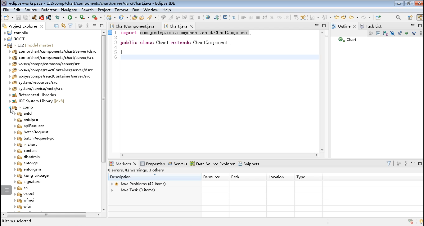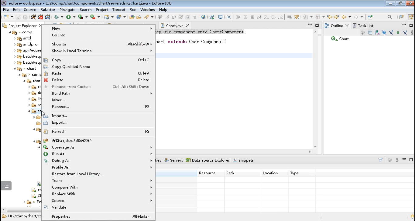 命名空间中的服务端编译文件在 UI2/comp/chart/components/chart/server 目录下,里面有src和dsrc,需要编译生成classes和dclasses。编译java文件需要使用本地ide,步骤如下: