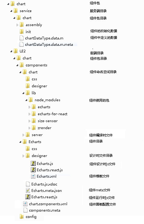 - 上面是组件包的文件结构,组件下载到ide后,前端代码在 UI2/comp 目录下,服务端代码在 service/comp 目录下