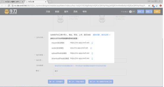在制作台的“发布”页面中,单击“第三步 导入微信开发者工具”按钮,显示出发布版本的服务器域名,如图2-13所示。