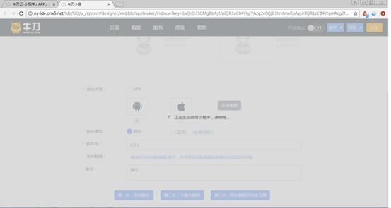 下载牛刀小店版本的方法是:进入“发布”页面,单击页面中的“第二步 下载小程序”按钮,页面中显示“正在生成微信小程序,请稍等…”,使用浏览器的下载功能,下载牛刀小店版本。如图2-14所示。