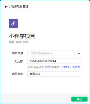 打开微信开发者工具。在微信开发者工具中新建一个项目,输入小程序账号的appid、项目名称、选择项目目录,例如:D:\微信小程序\shop。如图2-16所示。单击“确定”按钮,创建牛刀小店小程序项目。