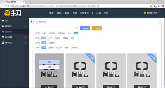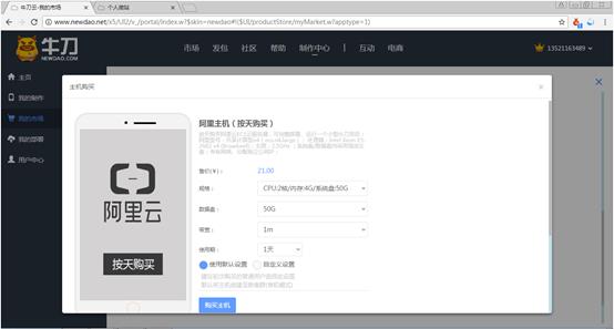在“我的市场”中购买主机。方法是:选择左侧功能树中的“我的市场”菜单命令,打开“牛刀云-我的市场”页面。选择“市场”中的“主机”,下面列出多种规格的主机,如图2-21所示。