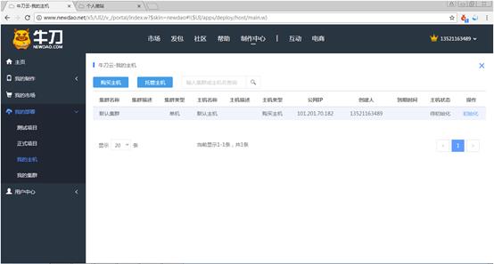 购买主机后,需要先进行主机初始化,才能发布到主机,主机初始化的方法是:选择侧功能树上的“我的部署”→“我的主机”菜单命令,打开“牛刀云-我的主机”页面。在主机列表中显示出刚购买的主机,如图2-24所示。