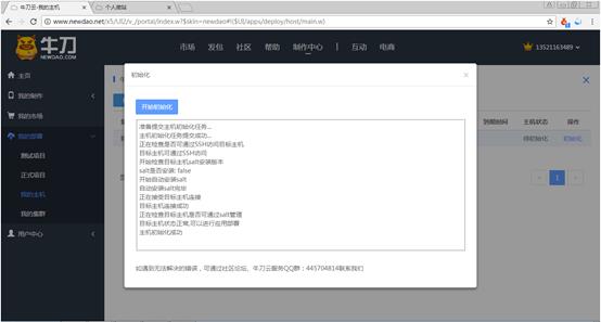 单击刚购买主机所在行的“操作”列中的“初始化”按钮,打开“初始化”对话框。单击“开始初始化”按钮,执行主机初始化。初始化进度在对话框内显示,其中有几个步骤执行时间较长。