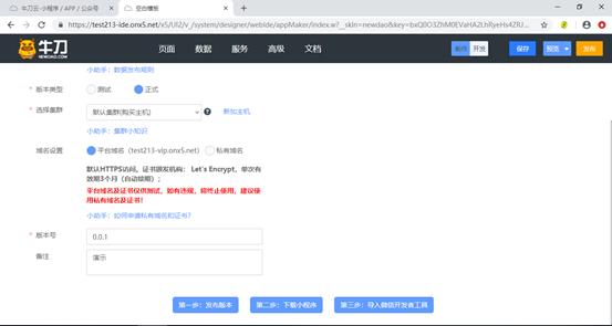 在主机初始化后,可以执行发布到主机。方法是:单击制作台顶部导航栏中的“发布”按钮,打开“发布”页面,如图2-26所示。在“版本类型”中选择“正式”,在“选择集群”中选择“默认集群”,单击“发布”按钮,将小程序发布到主机。