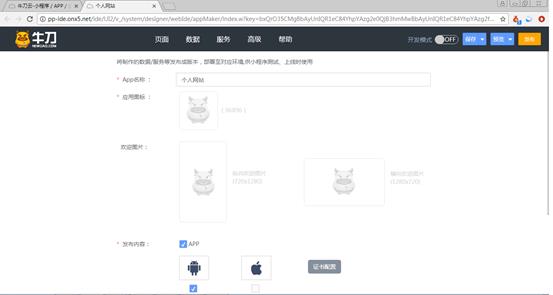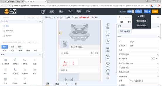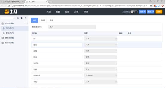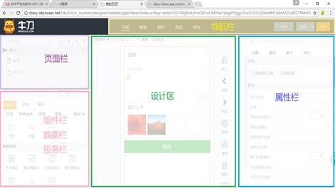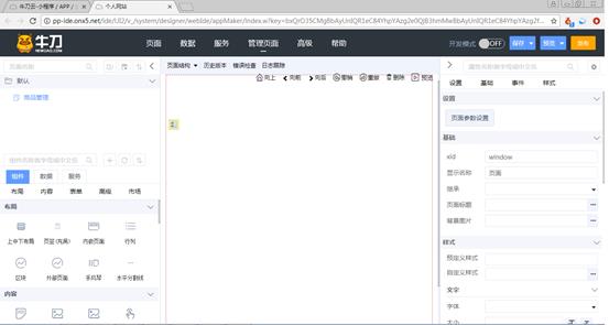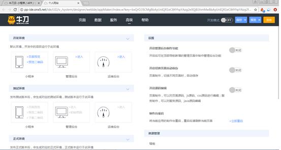 制作台的顶端是一个导航栏。通过导航栏进入页面制作区、数据制作区、服务制作区、管理后台制作区、IDE开发页面、高级页面、预览页面和发布页面。导航栏上还有一个进入开发模式的开关。