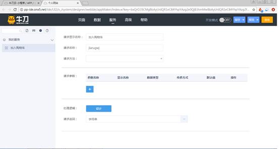 服务制作区分为2个部分,如图3-10所示:左侧的服务列表和右侧的服务详情。服务列表可以添加、删除服务和请求,还能添加数据方法。服务详情可以设置请求方法、请求参数、处理逻辑,以及设置请求返回类型。