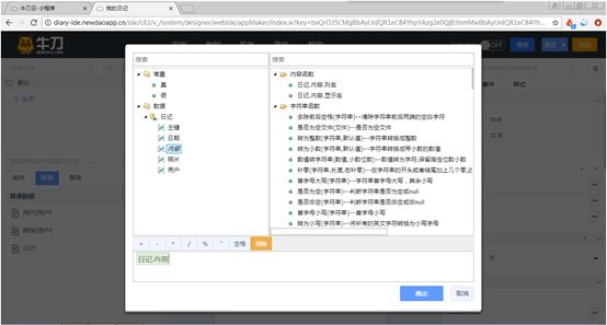 这里用来设置情景,就是什么情况下显示什么,暂且跳过这一步。单击“默认情景 文本为”右侧的…按钮,打开表达式编辑器。编辑器的左侧列出了页面上的数据集,展开数据集显示出数据集的列。例如要显示日记数据集中的内容列,就双击“内容”。编辑器的底部出现“日记.内容”,如图3-26所示。