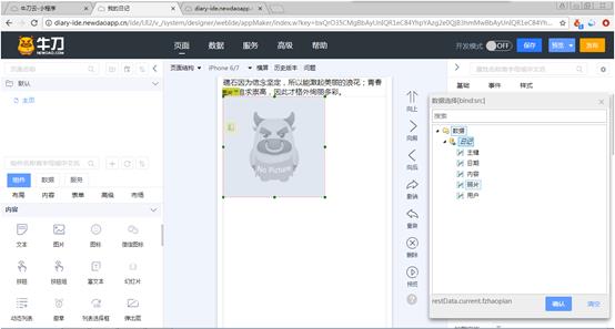 通常将“动态图片地址”属性设置为数据集的某一列,这样“图片”组件就显示这一列的内容。设置方法为:单击“动态图片地址”右侧的…按钮,打开“数据选择”对话框,这里列出了页面上的数据集,展开数据集显示出数据集的列,如图3-27所示。例如要显示日记数据集中的照片列,就双击“照片”。