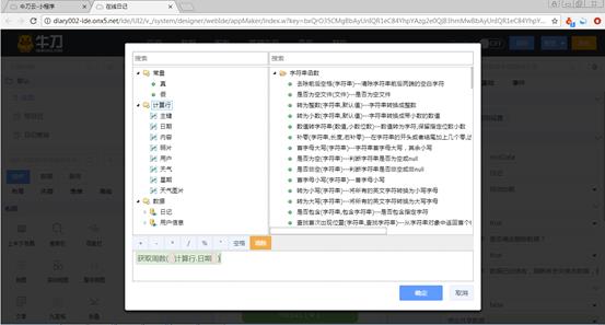 首先清空表达式区域输入框中的内容。在函数区域找到“日期时间函数”中的“获取周数”函数,双击“获取周数”函数,表达式区域的输入框中显示“获取周数( 时间 ) ”,单击“时间”,数据区域自动过滤,只显示类型为日期和日期时间的数据列,要获得日期列中日期的周数,因此双击“计算行”下面的“日期”列。表达式区域输入框的内容变为“获取周数( 计算行.日期 ) ”。表达式设置完毕。
