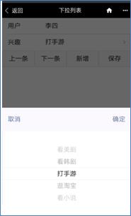 下拉列表是从屏幕底部弹出选项列表,如图4-50所示。提供单选能力,即选择其中一项后,自动关闭选项列表,将选择的数据显示在下拉列表组件中,同时存入下拉列表组件关联的数据集组件。