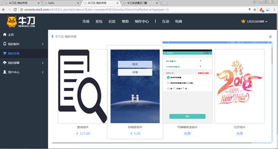 购买组件的流程是:将鼠标滑动到需要购买的组件的上方,出现“购买”和“详情”按钮,单击“购买”按钮,提示“确认购买并进行支付”,单击“确定”按钮确认购买,如果账户余额充足,会提示“购买成功”。购买后组件上的“购买”按钮变成“使用”按钮,如图4-81所示。