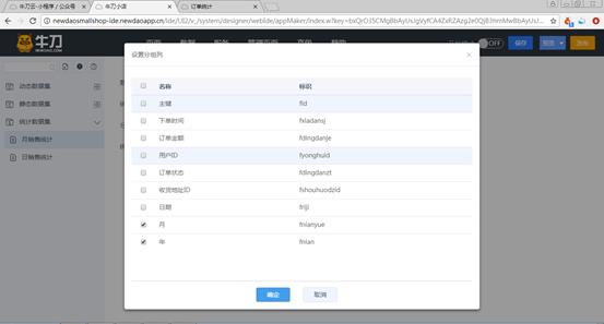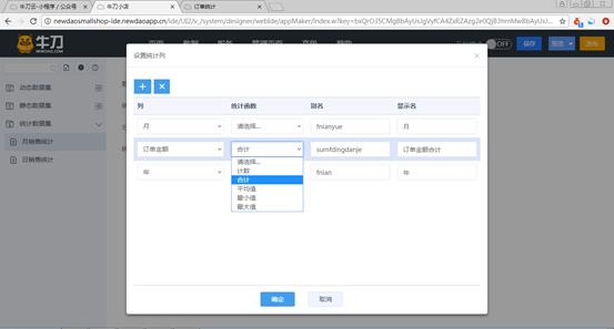 设置统计列对话框中,不仅要添加统计列,还要添加分组列。否则在页面中添加统计数据集组件后,找不到分组列。统计列需要设置“统计函数”,并且根据选择的统计函数生成“显示名”。显示名可修改。分组列默认生成的“显示名”是中英文混合的,因此一定要修改。页面中的统计数据集组件中的列名就是这里定义的显示名。