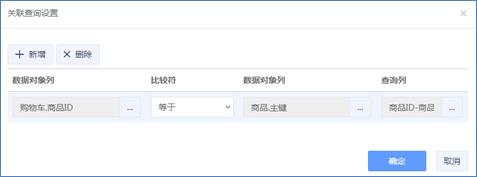 可以添加一个或多个关联查询。每个关联查询需要设置2个数据对象列、比较符和查询列。