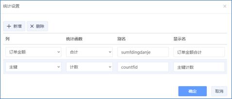 在前面讲解统计数据集时,讲到统计数据集只统计需要分组汇总的情况,对于不需要分组汇总的情况,可以使用数据集组件的统计功能实现。例如:在查询4月份订单的同时,还希望统计出4月份的订单量和订单总金额。其中订单量和订单总金额就是订单数据集的统计列。通过设置统计列,如图5-20所示,实现对本次查询全体数据的统计,受分页加载数据的影响,页面中显示的数据只是查询出的全体数据一部分。如果要统计页面上显示出的数据的汇总值,可以使用数据列的统计函数。参见“5.2.5函数”一节。