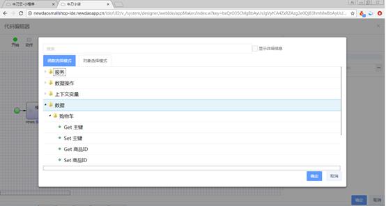 在声明变量、创建对象、使用动作返回值之后,这些变量就成为上下文变量,即在当前代码中可以访问的变量,根据变量的类型不同,变量的方法也不同。如图6-14所示,购物车是数据行对象,拥有列赋值和列取值的方法。