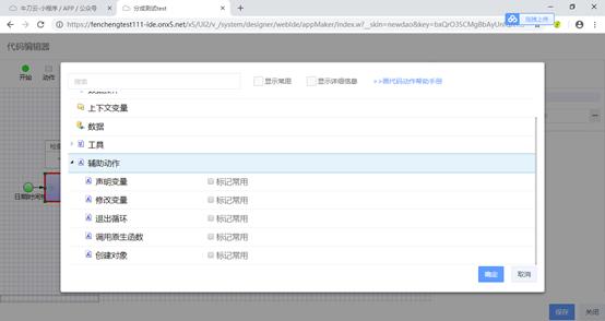 “辅助动作”下面的5个动作是常用动作,如图6-17所示。声明变量是新建一个简单类型的变量;创建对象是新建一个数据集类型的变量。调用原生函数是扩展能力,通过手写方法名调用java方法。
