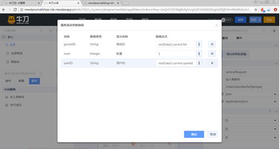 在主页上添加“加入购物车”服务请求组件。如果主页中还没有添加“用户”组件,就添加“用户”组件。设置“加入购物车”服务请求组件的参数,如图6-35所示。“商品ID”的值表达式设置为商品数据集的主键,“数量”设置为1,“用户ID”设置为用户信息的openid。