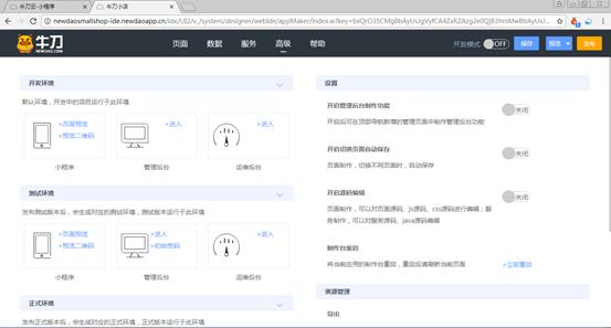 在正式发布后,打开制作台中的“高级”页面,可以看到“正式环境”区域中的“管理后台”图标右侧的“进入”和“初始密码”都是可用状态。登录方式同进入测试环境的管理后台一样。