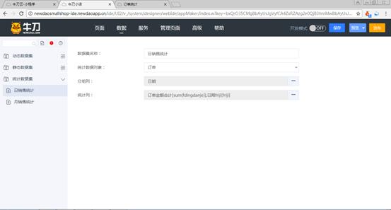 订单统计功能中需要使用3个数据集,2个统计数据集“日销售统计”和“月销售统计”,2个静态数据集“页面数据”和“页面数据2”。日销售统计数据集实现按日期汇总订单金额的功能。月销售统计数据集实现按年月汇总订单金额的功能。2个页面数据数据集作为页面中的临时数据存储单元。