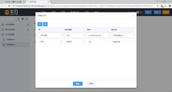 | 统计数据集 | 日销售统计 | 自动加载数据=取消选中 过滤=日期 大于等于 页面数据.开始日期 日期 小于等于 页面数据.截至日期 排序=销售日期 降序 |