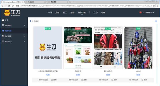 在选择发布数据后,单击“发布模板”按钮发布应用模板。如果应用模板为私有模板,此时可以在市场中看到该模板,如果应用模板为公有模板,需要等待管理员审核。若审核通过,在我的市场→上传模板页面中,该模板上显示“已上传”标签,如图9-6所示,在牛刀市场中即可搜索到此模板。若审核失败,该模板上显示“已退回”标签,在“审核记录”中可查看退回说明,需要对该模板进行修改,然后更新模板。更新模板的方法是:在高级页面中导出资源包,单击模板上的“更新”按钮,修改模板详情,重新上传文件,等待审核。